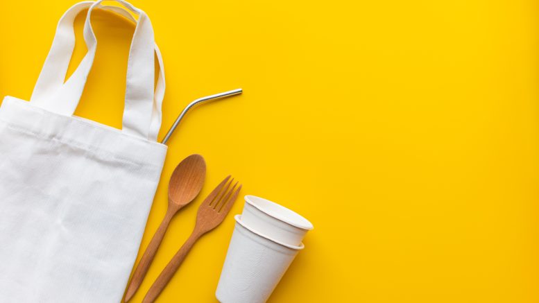 Flat lay of sustainable products, spoon wooden and stainless straw in cloth bag on yellow background, environment and eco concept.
